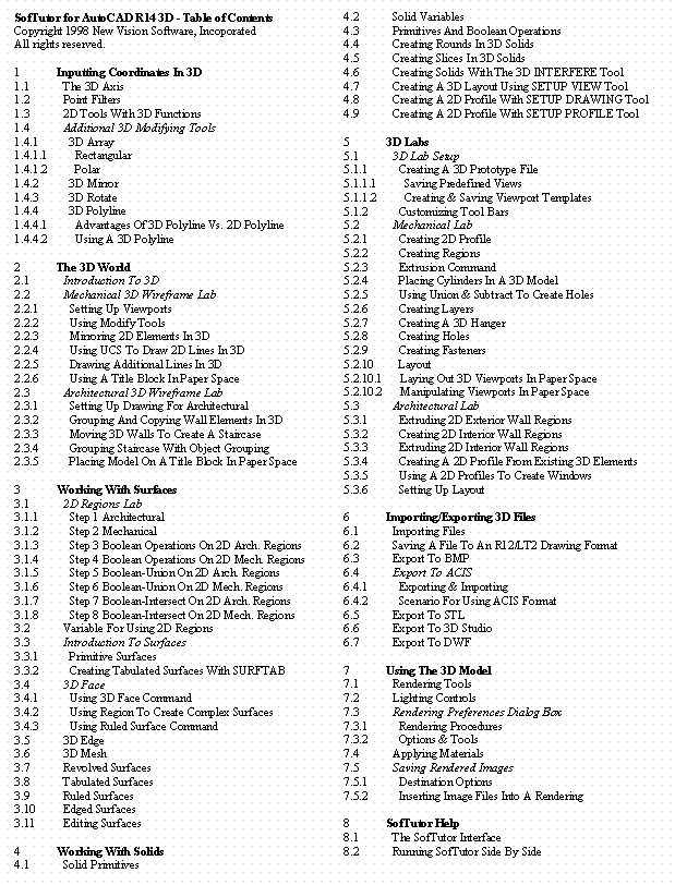 SofTutor for AutoCAD 3D with over 6.7 hours of instruction, SofTutor will make you a AutoCAD power user in hours not months. There are over 313 topics are indexed for quick reference too!